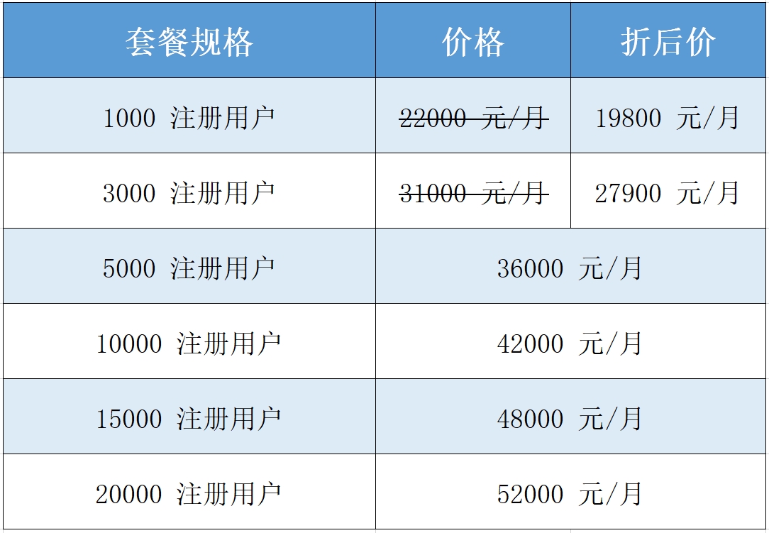 价格与购买方式 新购及续费可联系客服选购所需注册用户数量相应规格的软件套餐,按月续期付费 新客优惠:活动期间,部分套餐前3个月享9折优惠。 关于新购:出于合规要求,购买软件须提供企业资质证明(企业营业执照、法定代表人身份核验、合同签署等);关于续费:本软件按月续费,已购买软件的客户请在每月到期前续费,以免影响使用。客户也可在续费时根据实际使用情况进行套餐更改;关于扩容:已购买软件的客户可以在使用过程中申请增加相应企业ID的注册用户上限(即扩容),扩容价格按相应套餐的差价即可,不足一个月按 剩余天数/当月总天数计算 注: 企讯达是企业私有化部署即时通信软件。出于合规要求,购买软件须提供企业资质证明(企业营业执照、法定代表人身份核验、线上合同签署等);如购买使用软件请务必阅读并充分理解《企讯达软件购买及服务协议》,并遵守其中条款;请您自选企业号告知客服,付款后客服将为您部署软件到企业专属服务器,部署完成后将交付企业专用管理后台地址及用户名初始密码,您可自行下载手机 APP。